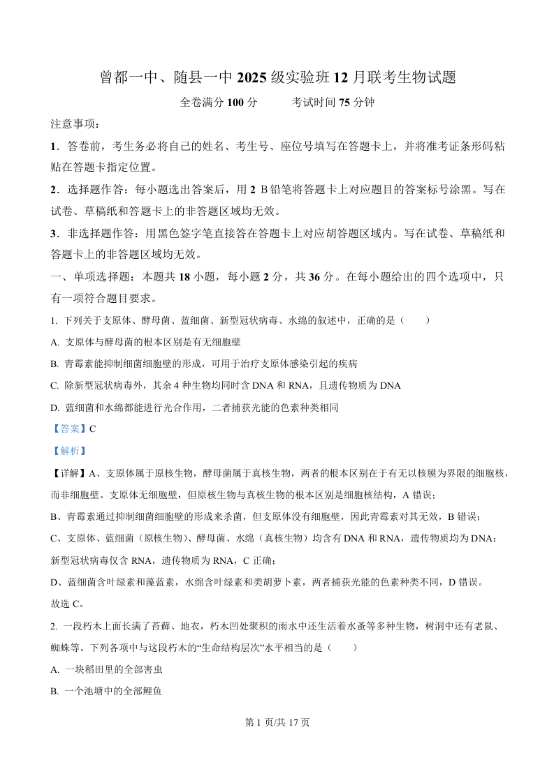 湖北随县一中、曾都一中2025级高一实验班12月联考 生物答案.docx