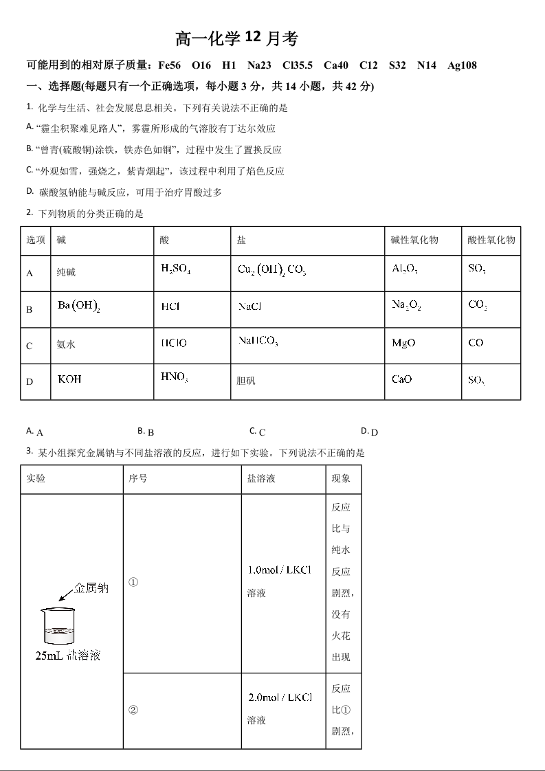 吉林省梅河口市第五中学2025-2026学年高一上学期12月月考 化学试题(含答案).docx
