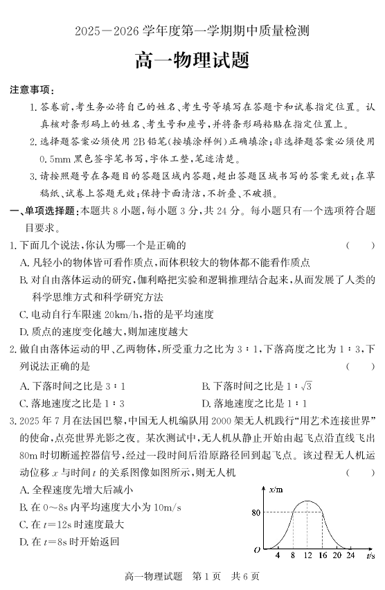 山东省济宁市兖州区2025-2026学年高一上学期期中质量检测 物理.pdf