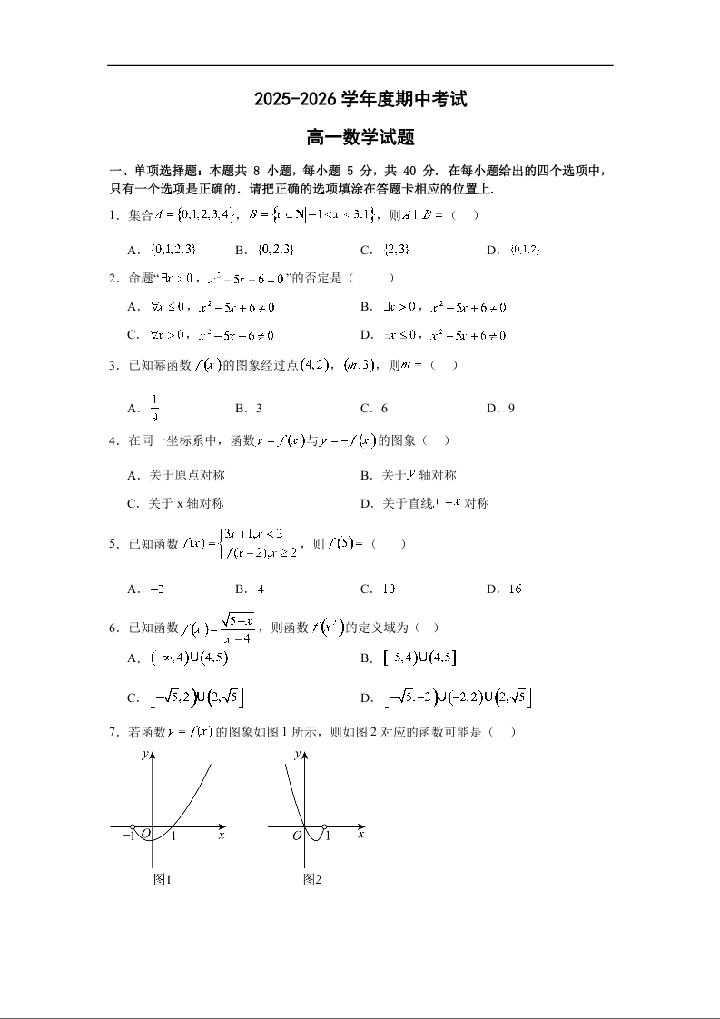 山东省济宁市兖州区2025-2026学年高一上学期期中质量检测 数学答案.docx