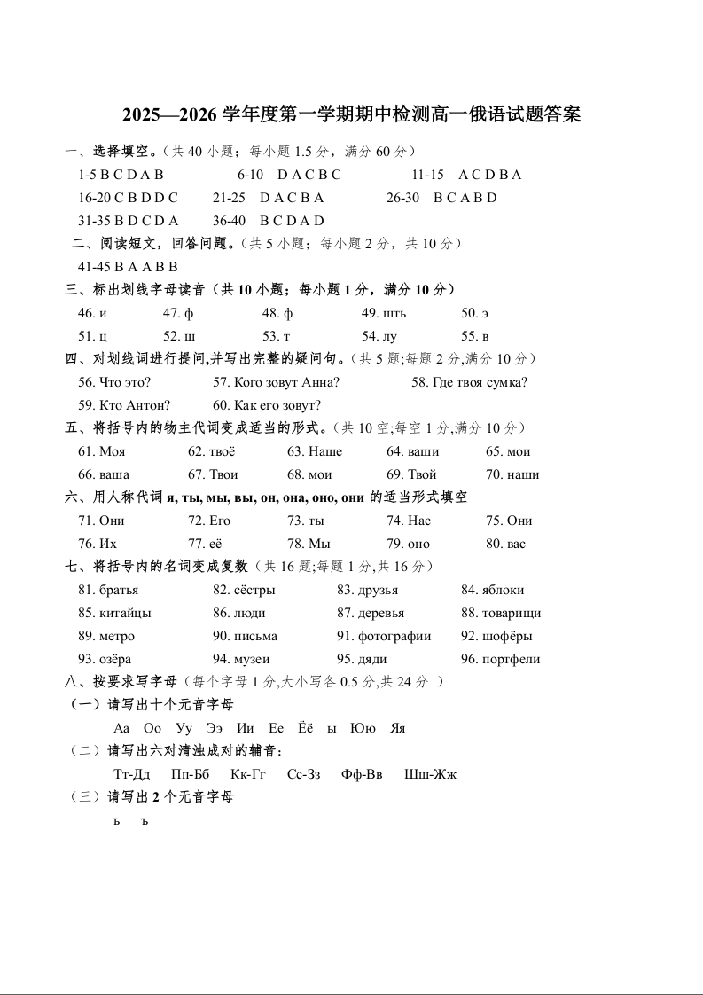 山东省济宁市兖州区2025-2026学年高一上学期期中质量检测 俄语答案.docx