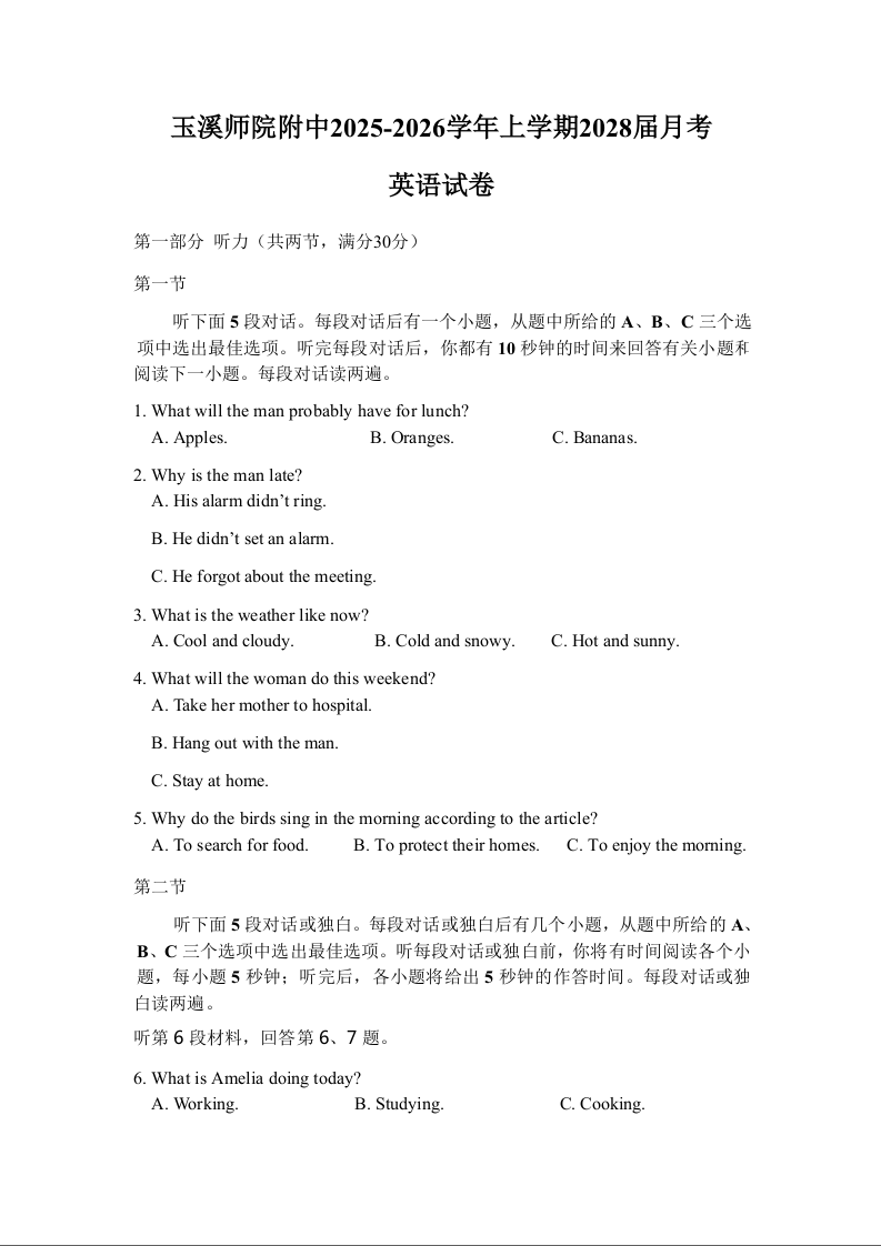 玉溪师院附中2028届高一上学期第二次校测 英语.docx
