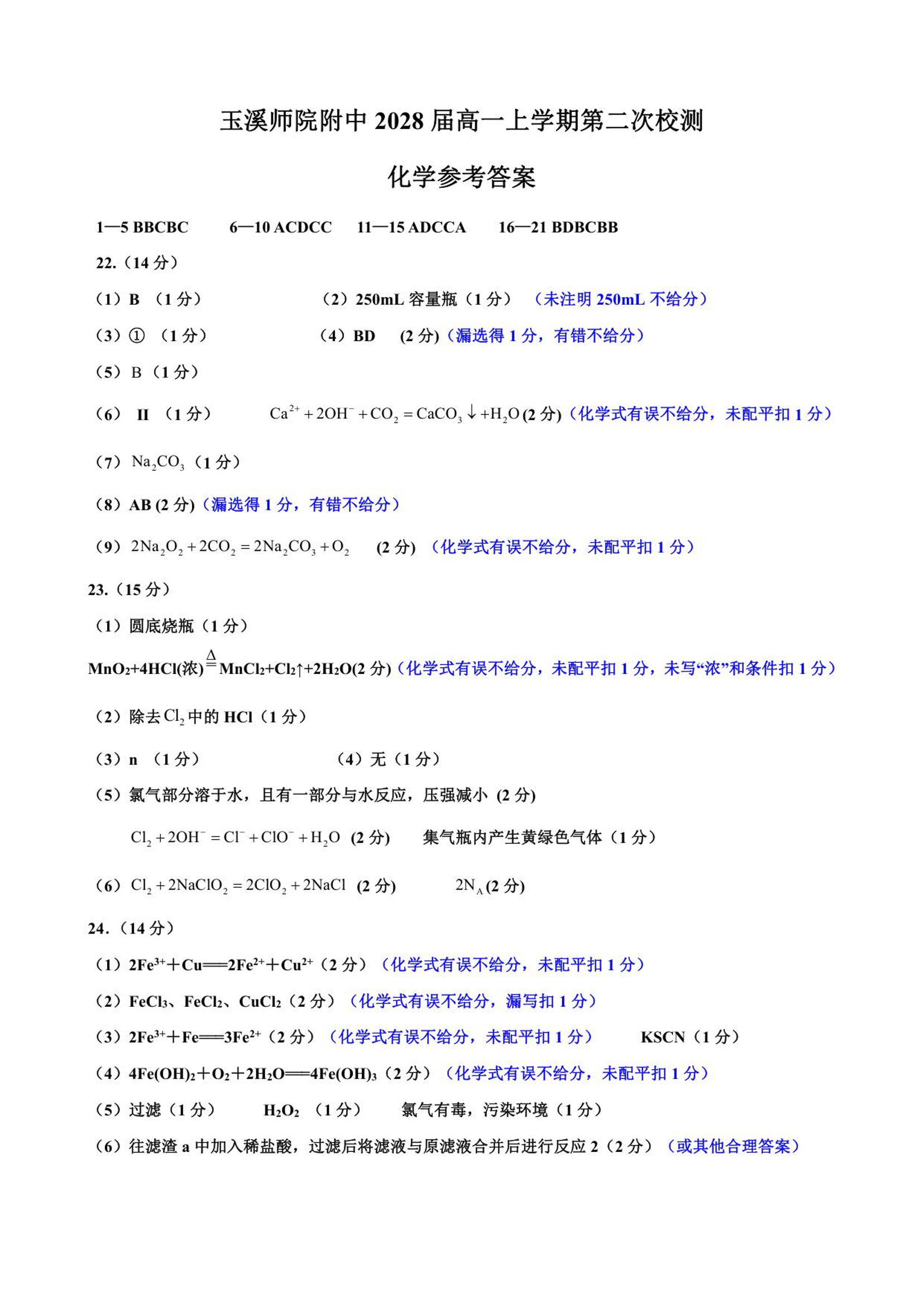 玉溪师院附中2028届高一上学期第二次校测 化学答案.pdf