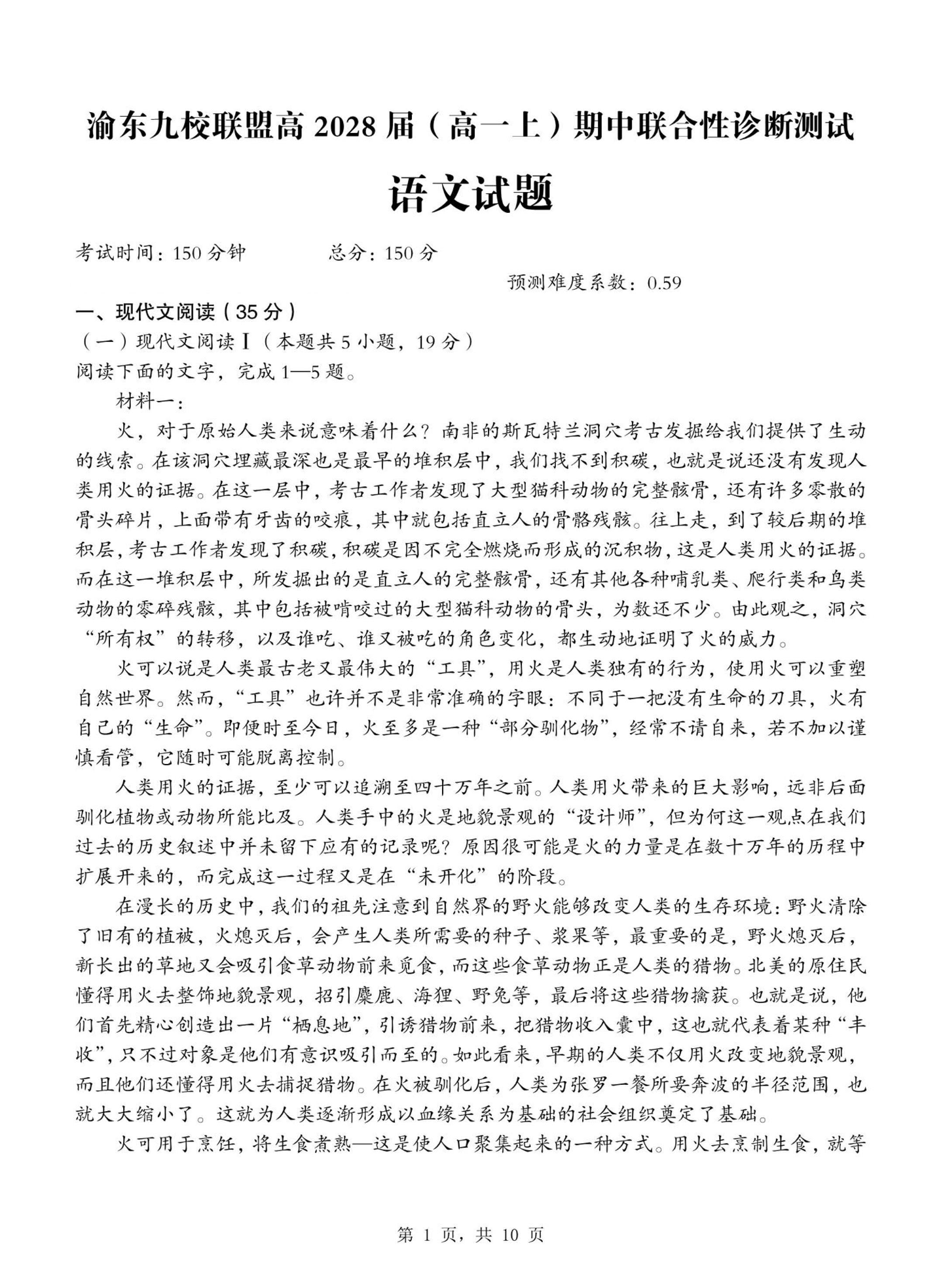渝东九校联盟2028届(高一上)期中联合性诊断测试 语文试题(含答案).pdf