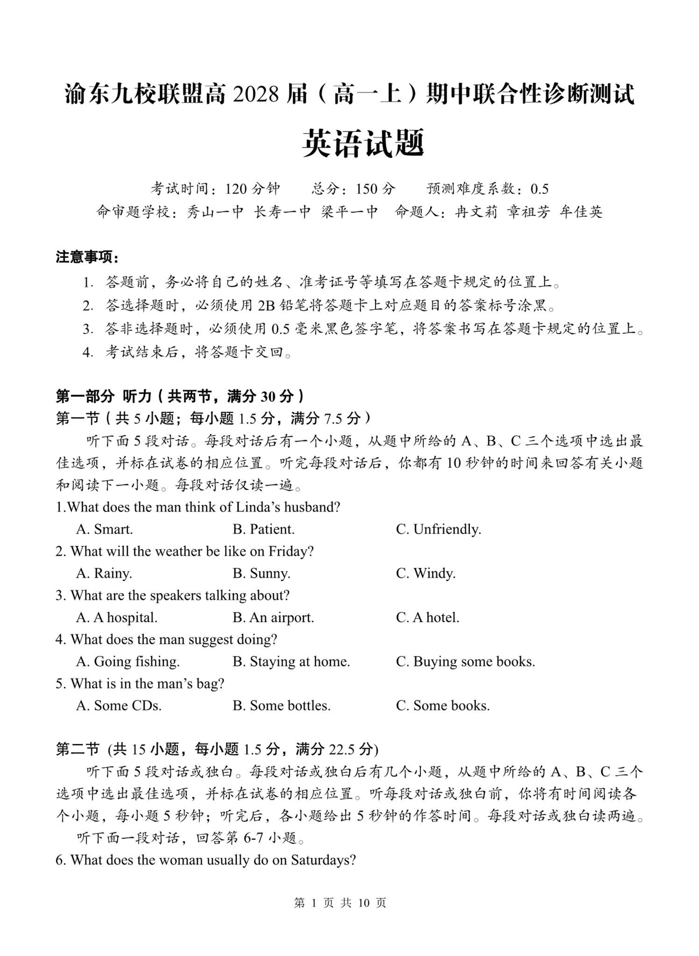 渝东九校联盟2028届(高一上)期中联合性诊断测试 英语试题(含答案).pdf