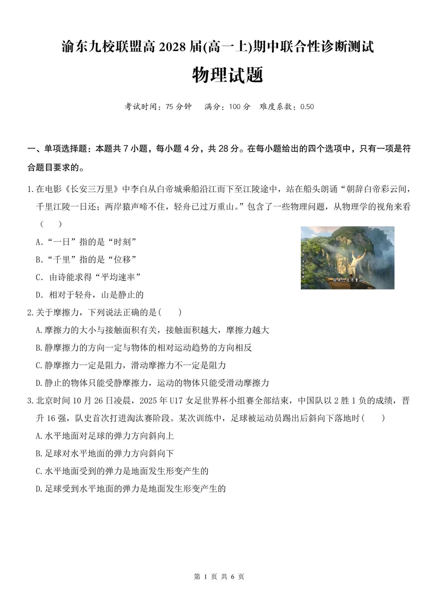 渝东九校联盟2028届(高一上)期中联合性诊断测试 物理试题(含答案).pdf
