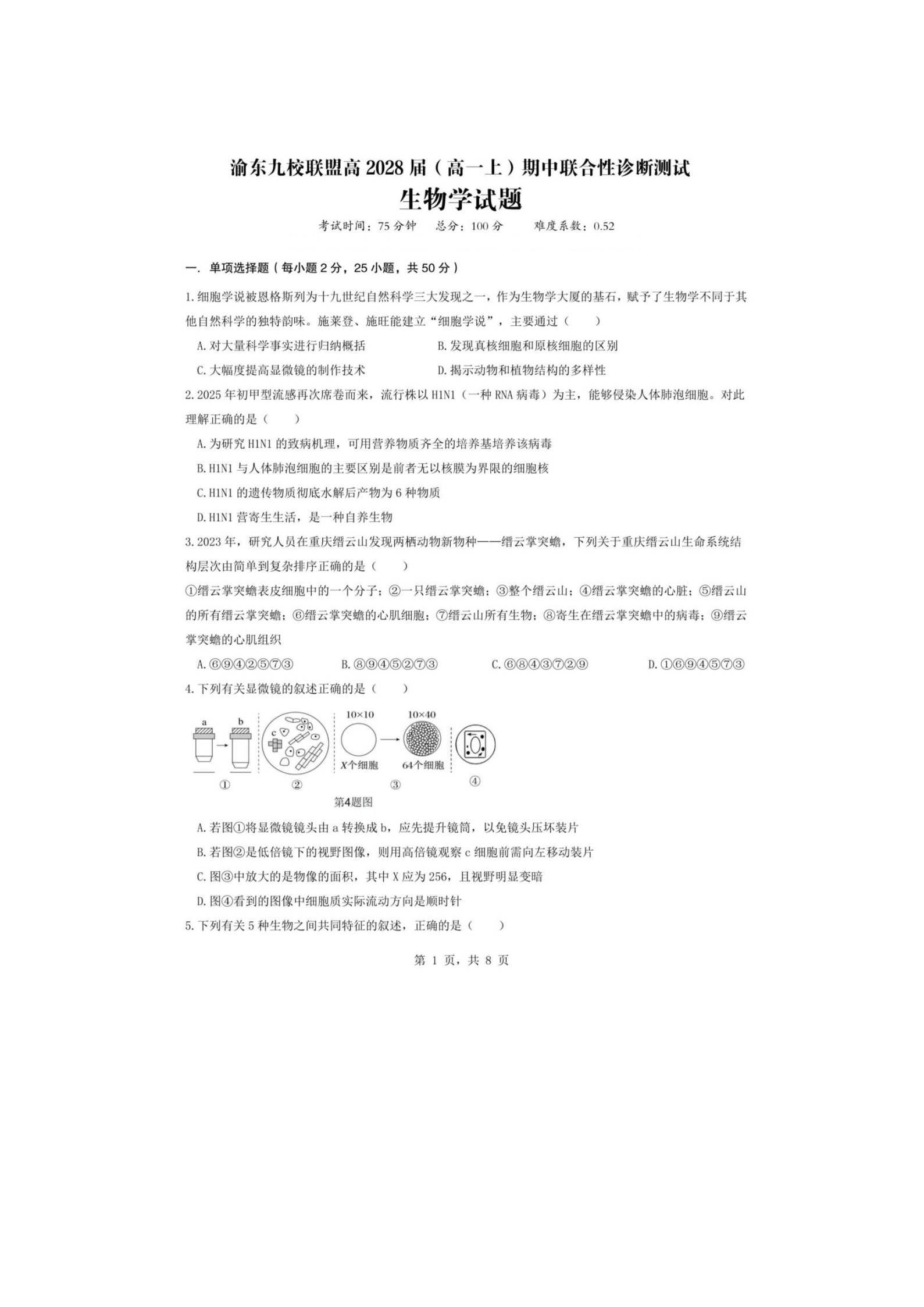 渝东九校联盟2028届(高一上)期中联合性诊断测试 生物试题(含答案).pdf