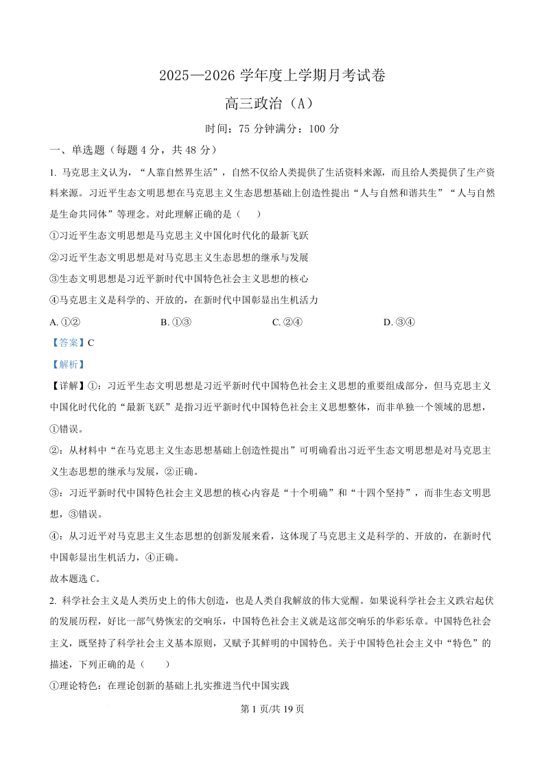 辽宁省鞍山市普通高中2026届高三上学期12月月考 政治答案.docx