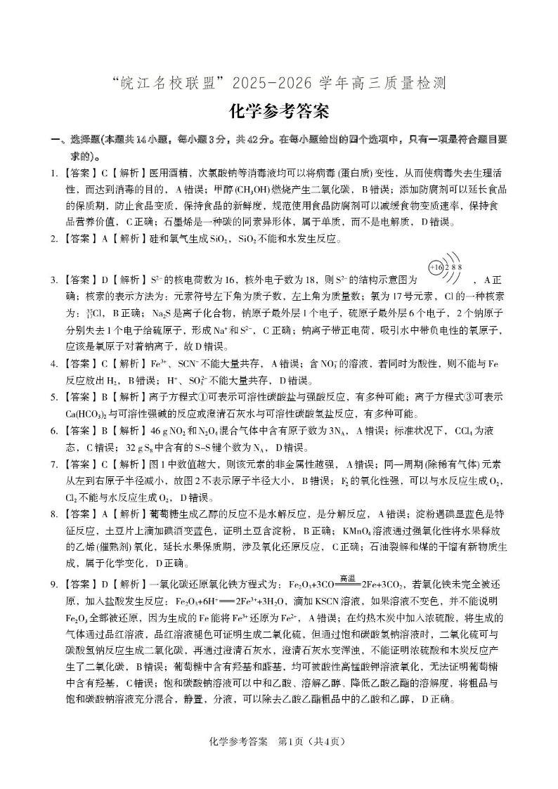 “皖江名校联盟”2025-2026学年高三质量检测 化学答案.pdf