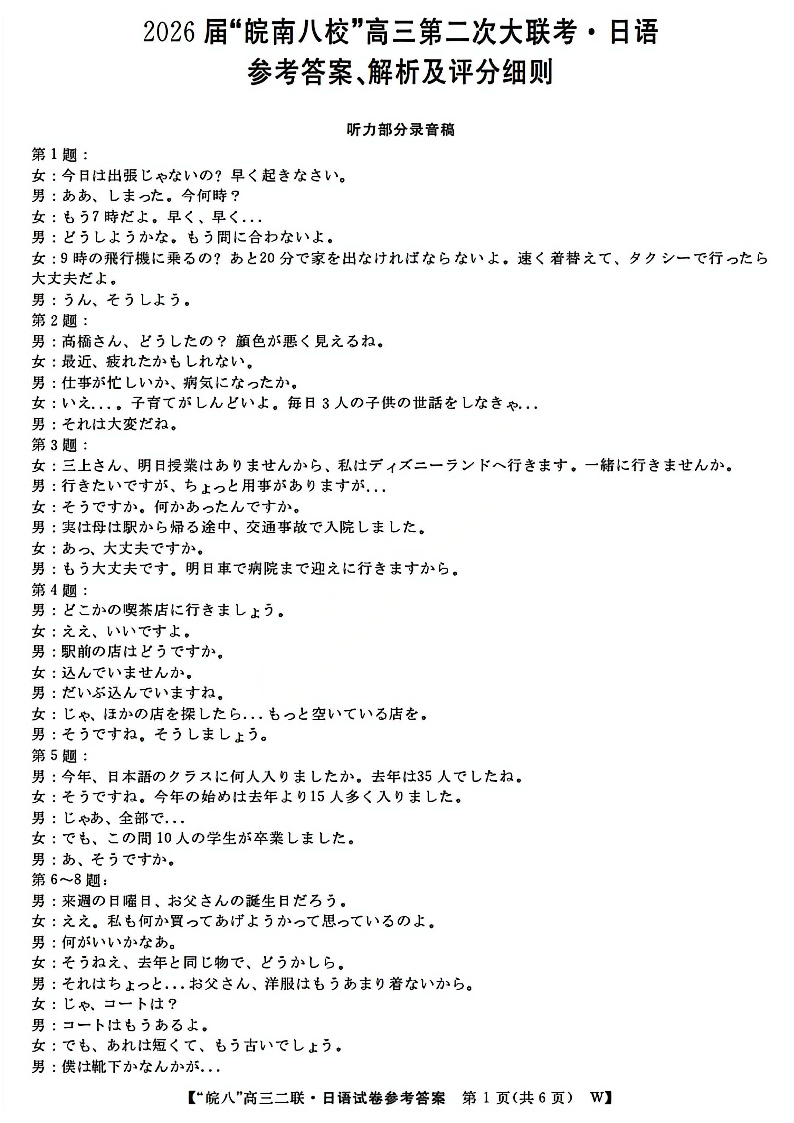 2026届“皖南八校”高三第二次大联考 日语答案.pdf