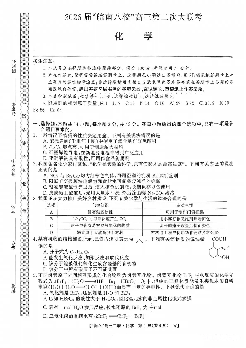2026届“皖南八校”高三第二次大联考 化学.pdf