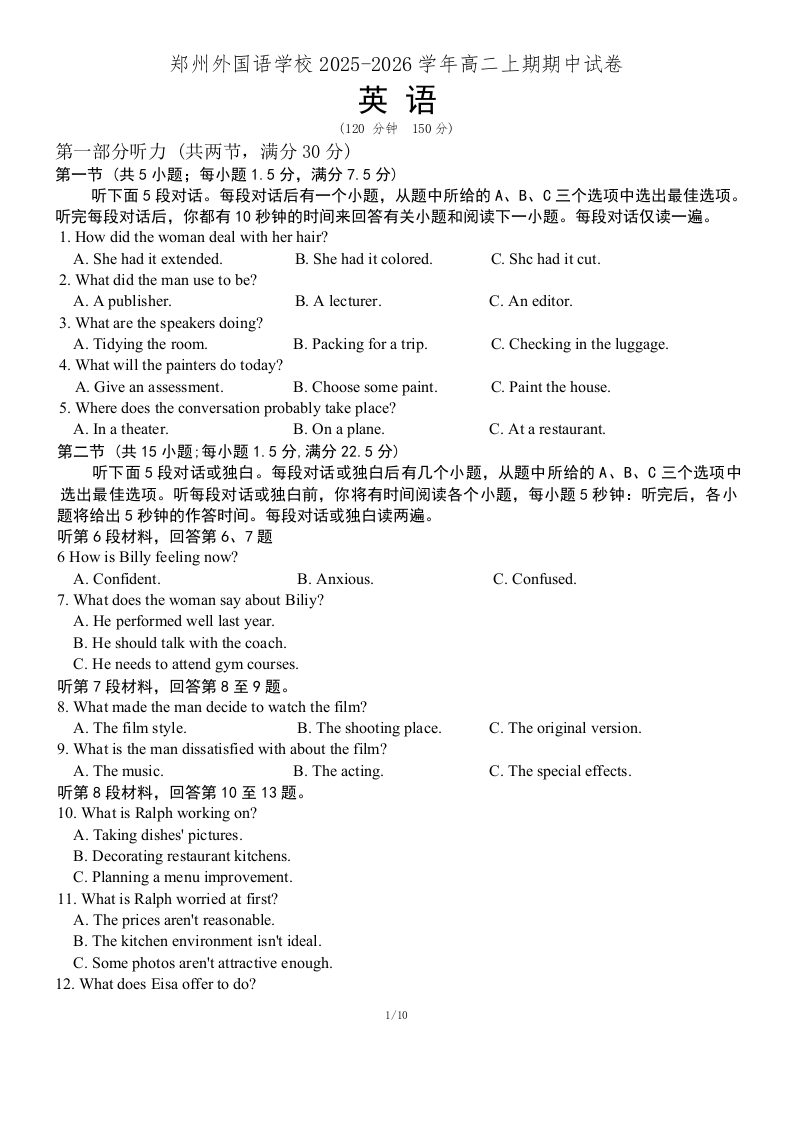 郑州外国语学校2025-2026学年高二上学期期中考试 英语试题(含答案).docx