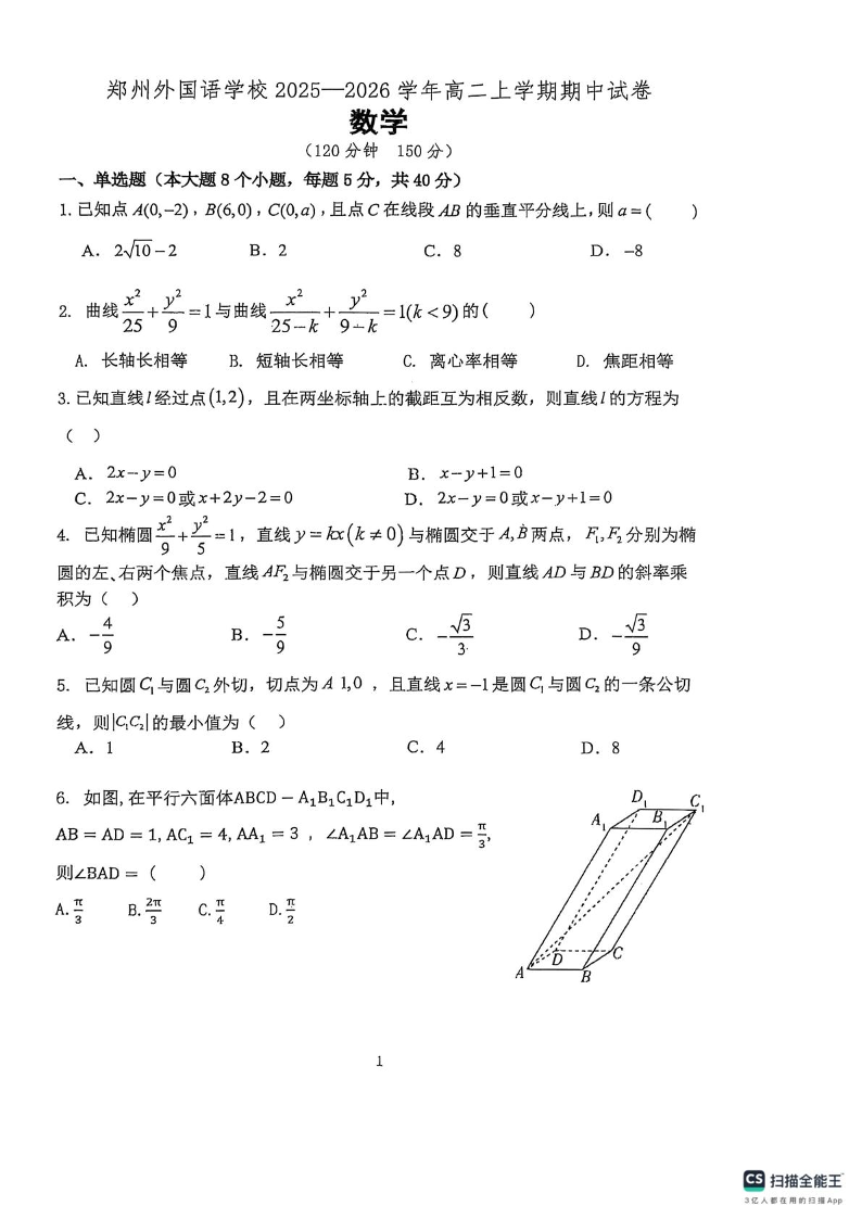 郑州外国语学校2025-2026学年高二上学期期中考试 数学试题(含答案).pdf
