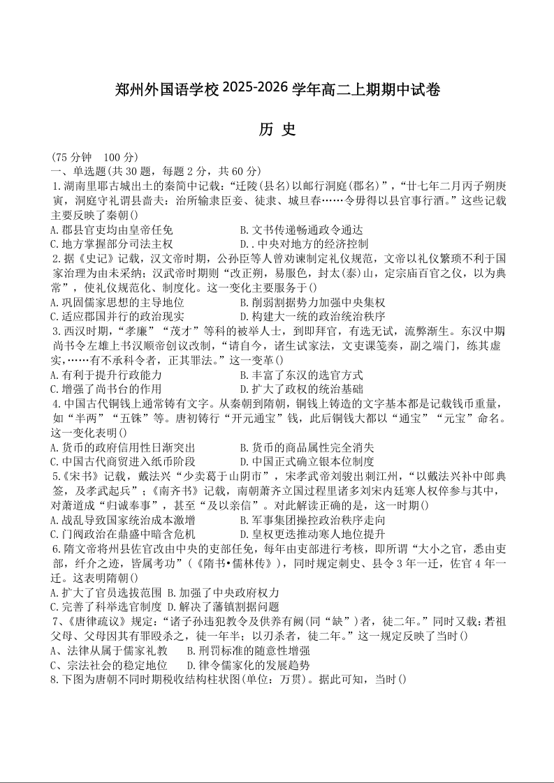 郑州外国语学校2025-2026学年高二上学期期中考试 历史试题(含答案).docx
