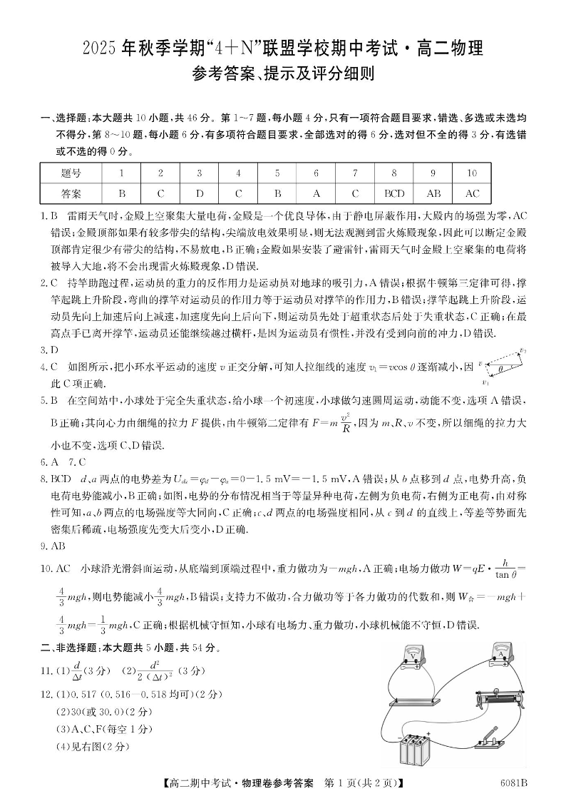 南宁市2025秋季学期4+N联盟学校高二期中考试 物理答案.pdf