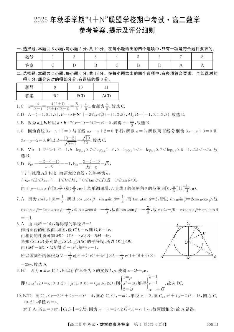 南宁市2025秋季学期4+N联盟学校高二期中考试 数学答案.pdf