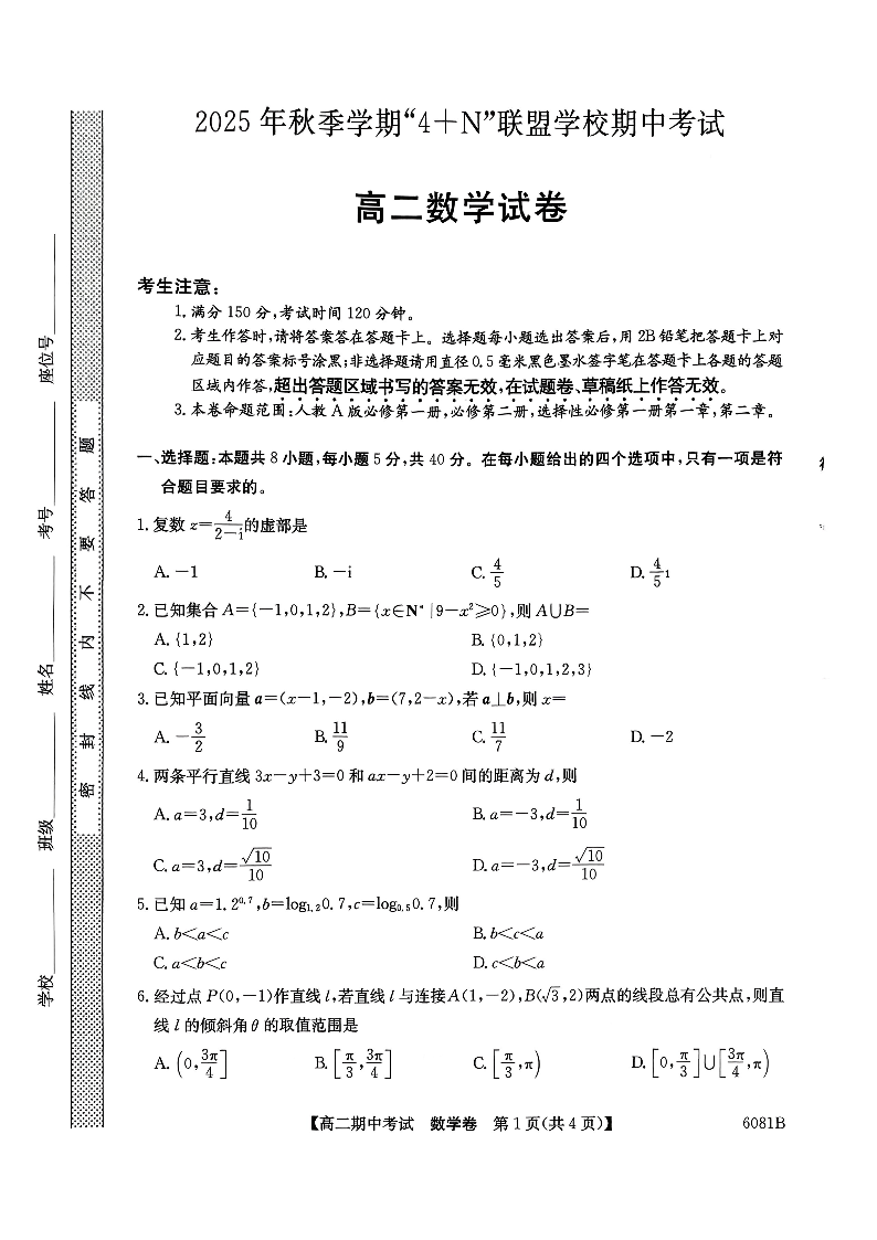南宁市2025秋季学期4+N联盟学校高二期中考试 数学.pdf
