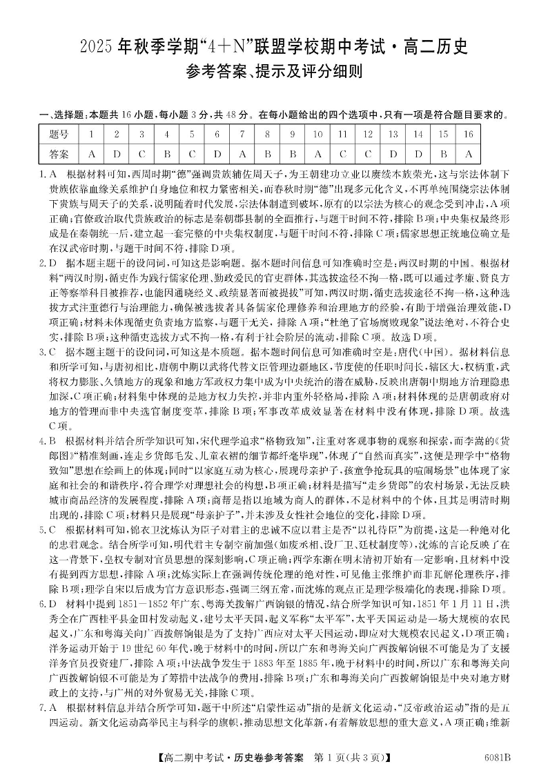 南宁市2025秋季学期4+N联盟学校高二期中考试 历史答案.pdf