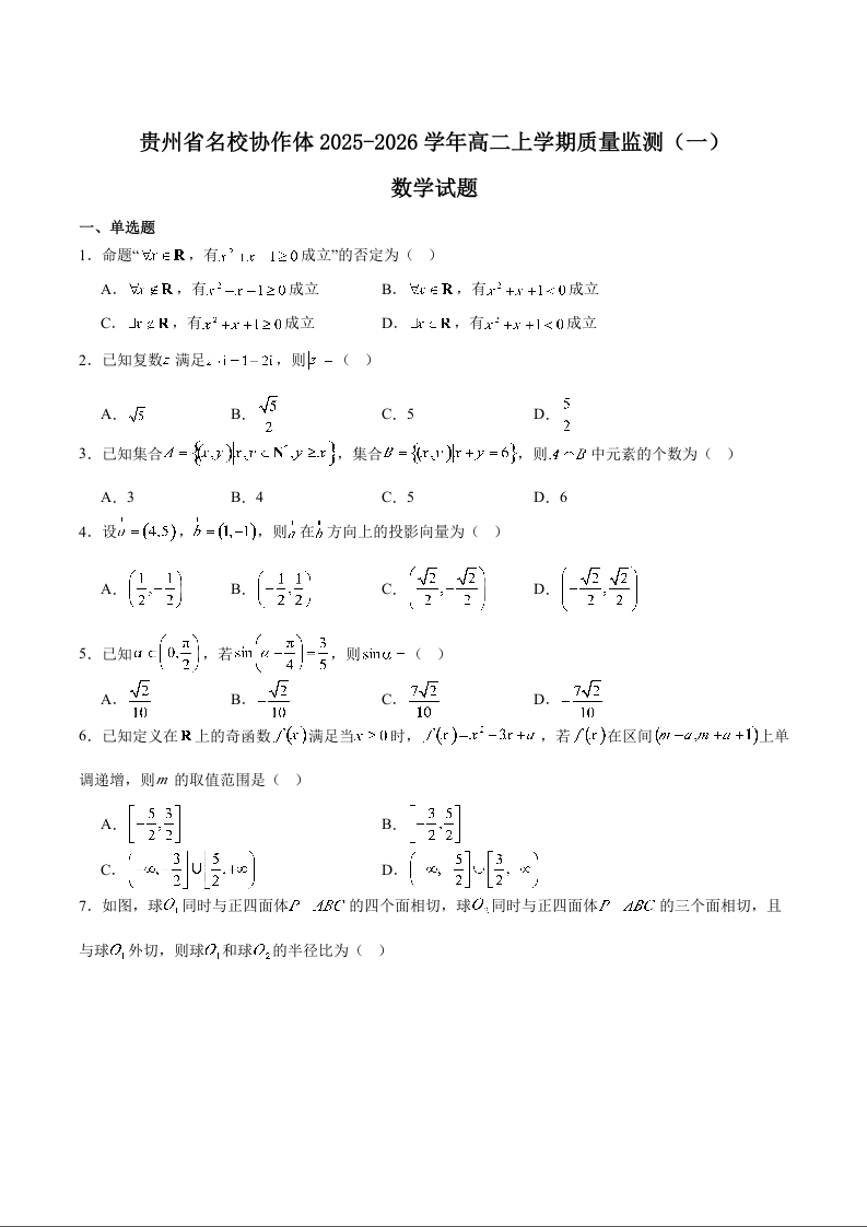 贵州省名校协作体2025-2026学年高二上学期期中质量监测(一)数学试题(含答案).docx