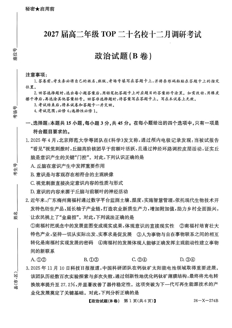 2027届高二年级TOP二十名校十二月调研考试 政治试题(含答案).pdf