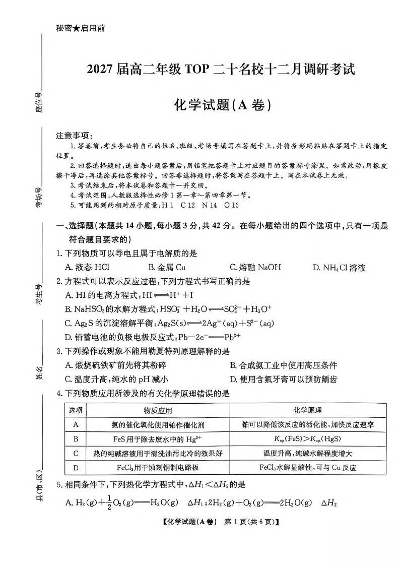 2027届高二年级TOP二十名校十二月调研考试 化学试题(含答案).pdf