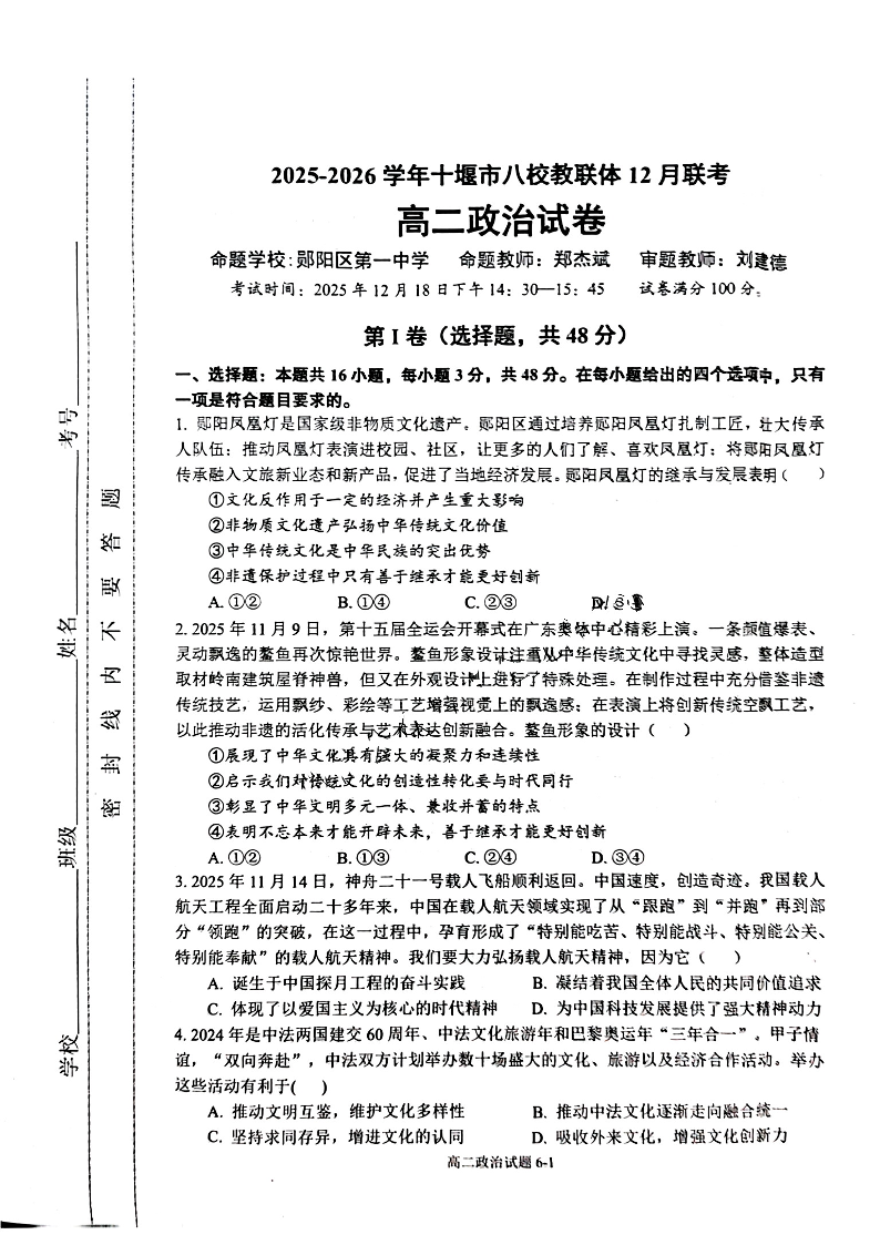 湖北省2025-2026学年十堰市八校教联体高二年级12月联考 政治试题(含答案).pdf