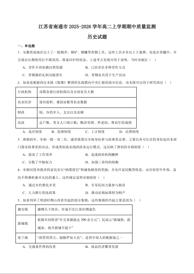 江苏省南通市2025-2026学年高二上学期期中考试 历史试题(含答案).docx