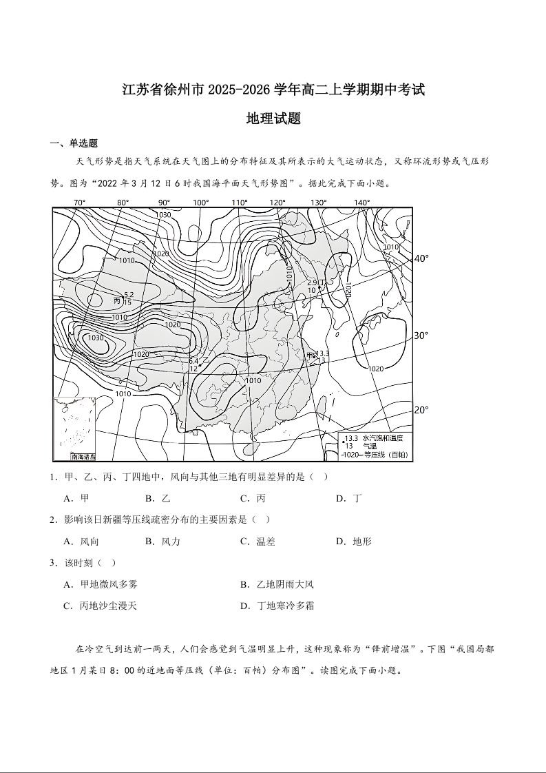 江苏省徐州市2025-2026学年高二上学期期中考试 地理试题(含答案).docx