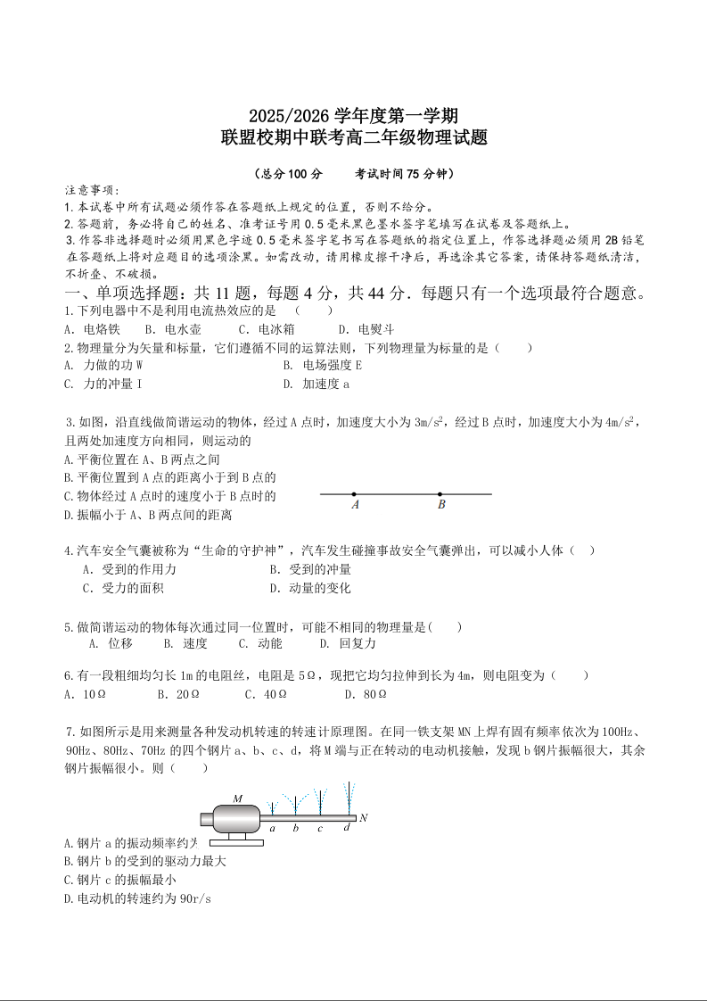 江苏省盐城市五校2025-2026学年高二上学期期中联考 物理试题(含答案).docx