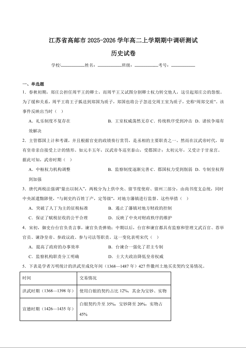 江苏省扬州市高邮市2025-2026学年高二上学期期中考试 历史试题(含答案).docx