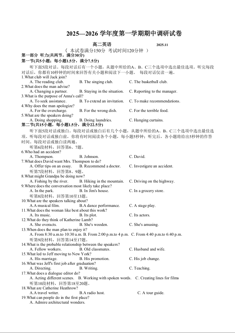 江苏省扬州市邗江区2025-2026学年高二上学期期中考试 英语试题(含答案).docx
