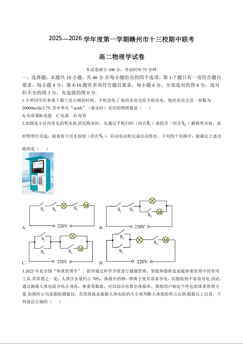 江西省赣州市十三校2025-2026学年高二上学期期中联考 物理试题(含答案).docx