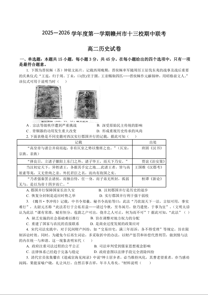 江西省赣州市十三校2025-2026学年高二上学期期中联考 历史试题(含答案).docx