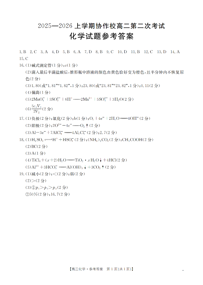 辽宁省葫芦岛市(县)2025-2026学年高二上学期协作校第二次考试 化学答案.pdf