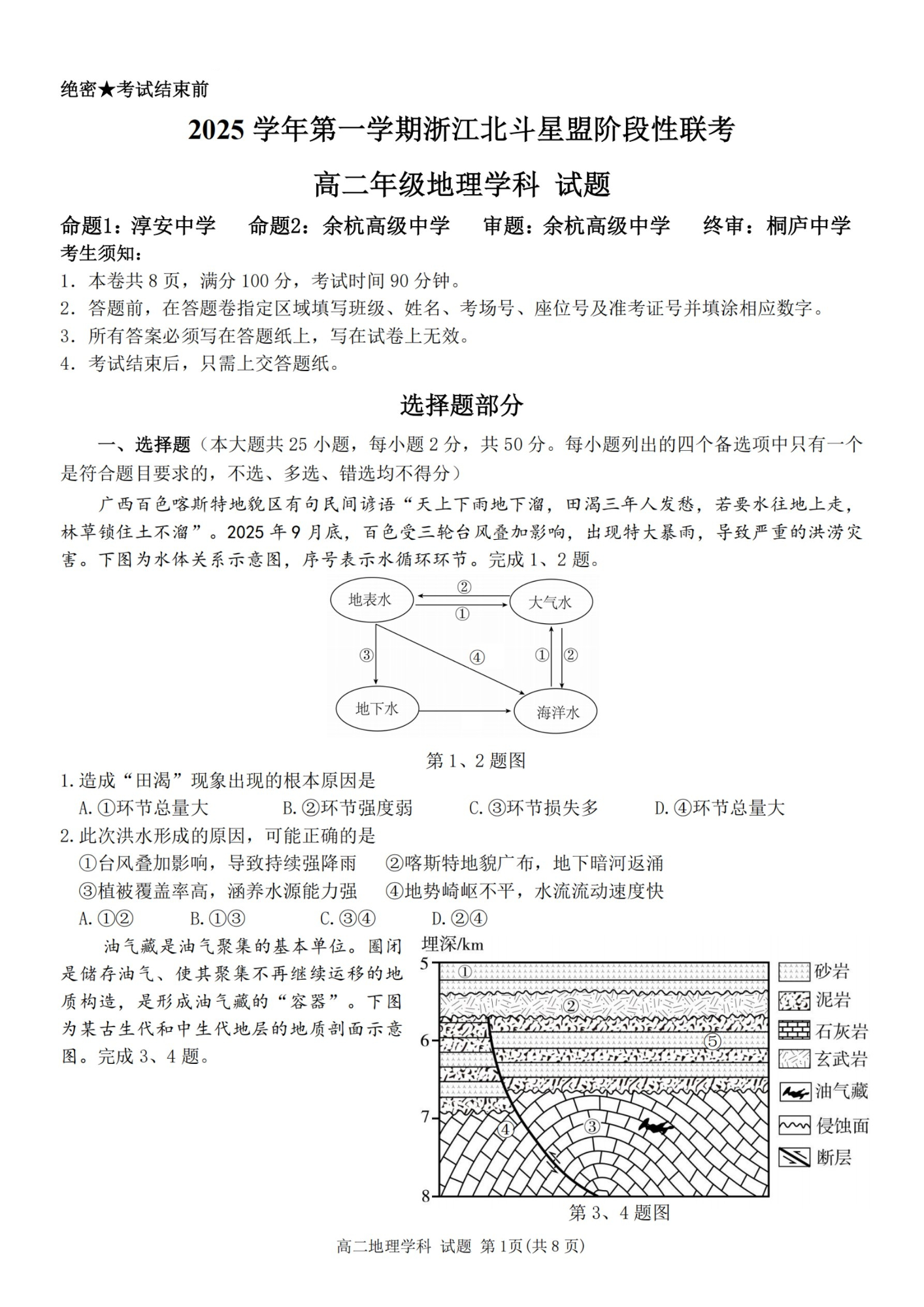 地理试卷-2025学年第一学期浙江北斗星盟高二年级阶段性联考.pdf