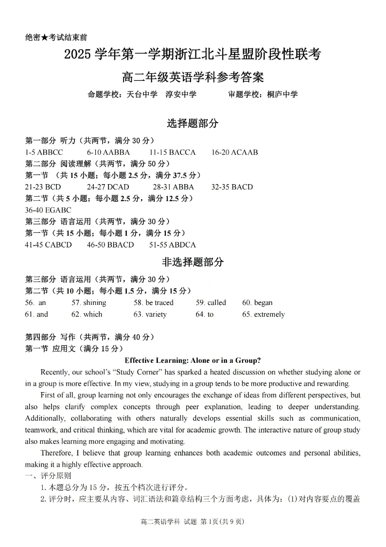 英语答案-2025学年第一学期浙江北斗星盟高二年级阶段性联考.pdf