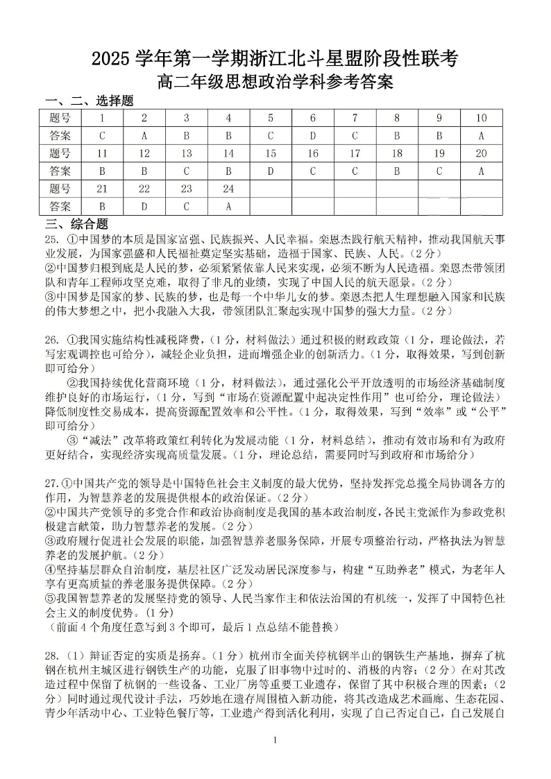 政治答案-2025学年第一学期浙江北斗星盟高二年级阶段性联考.pdf