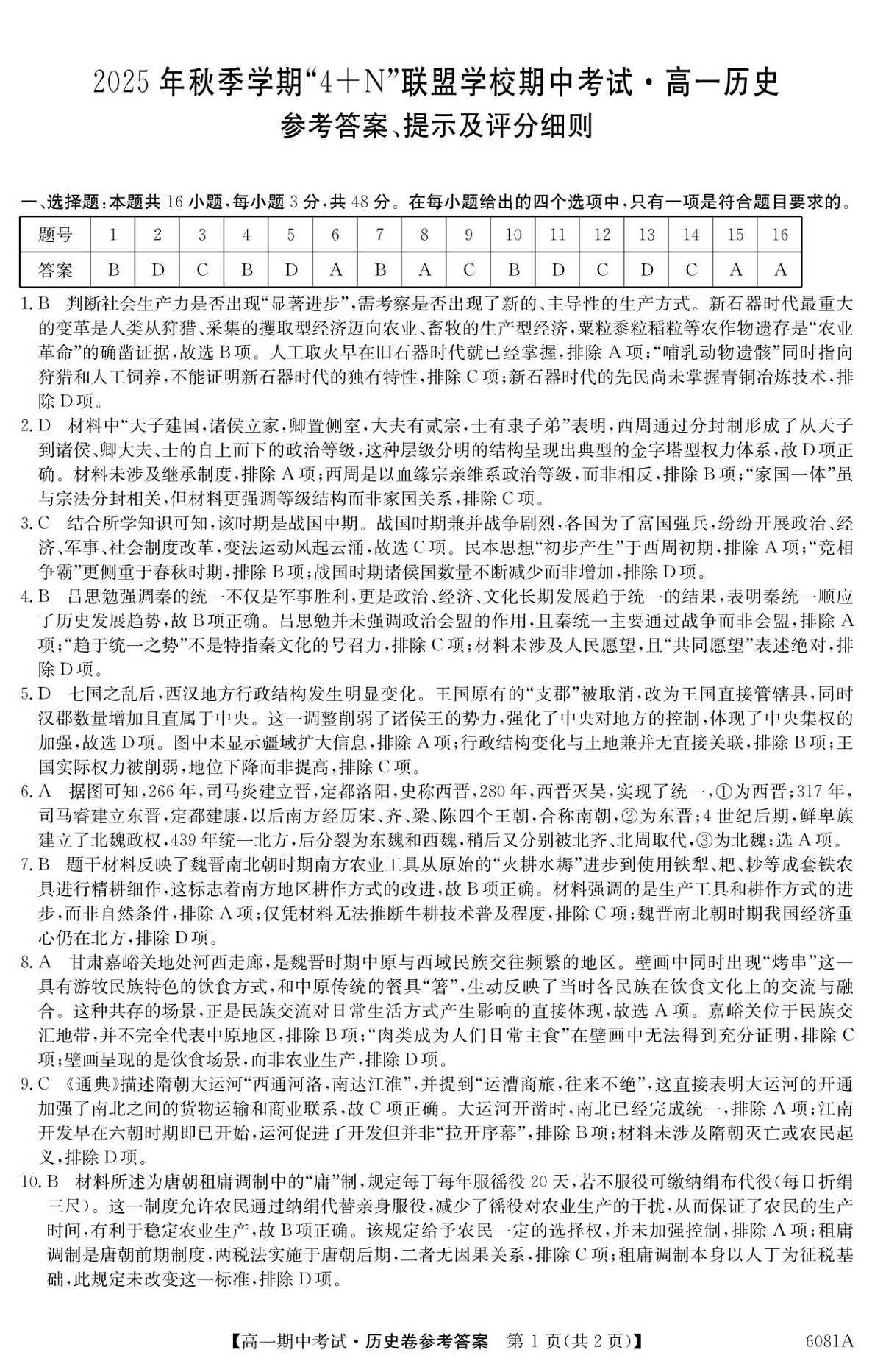 南宁市2025年秋季学期4+N联盟学校高一年级12月期中考试 历史答案.pdf