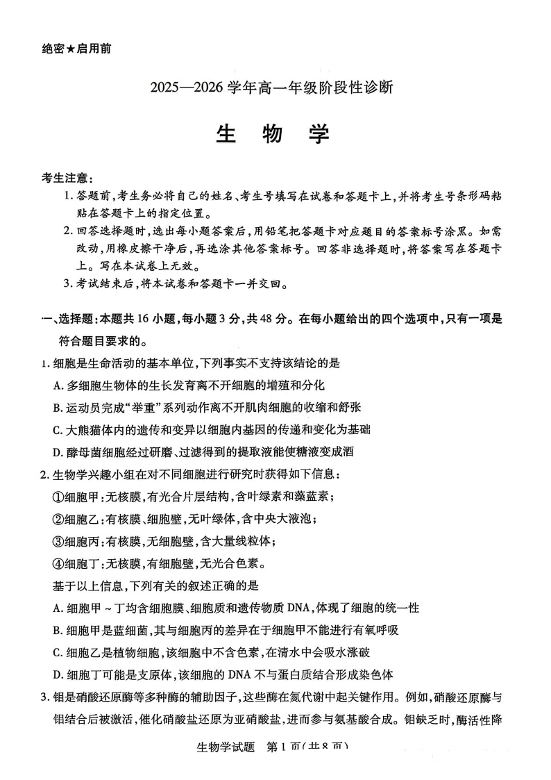 天一大联考2025-2026学年高一年级12月阶段性诊断 生物.pdf