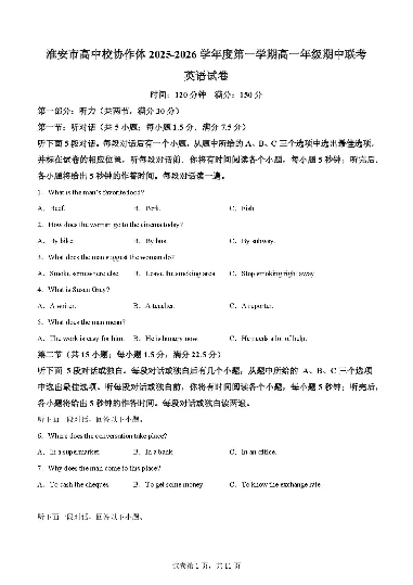 江苏省淮安市高中校协作体2025-2026学年高一上学期期中联考 英语试题(含答案).pdf