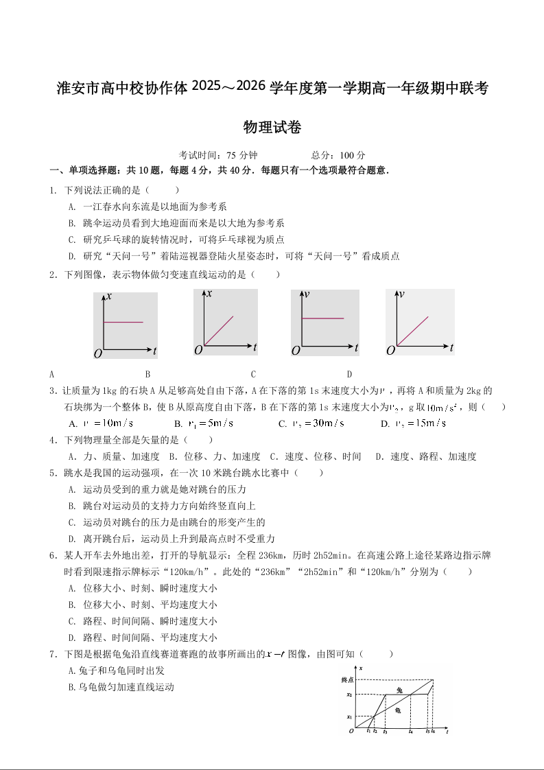 江苏省淮安市高中校协作体2025-2026学年高一上学期期中联考 物理试题(含答案).docx