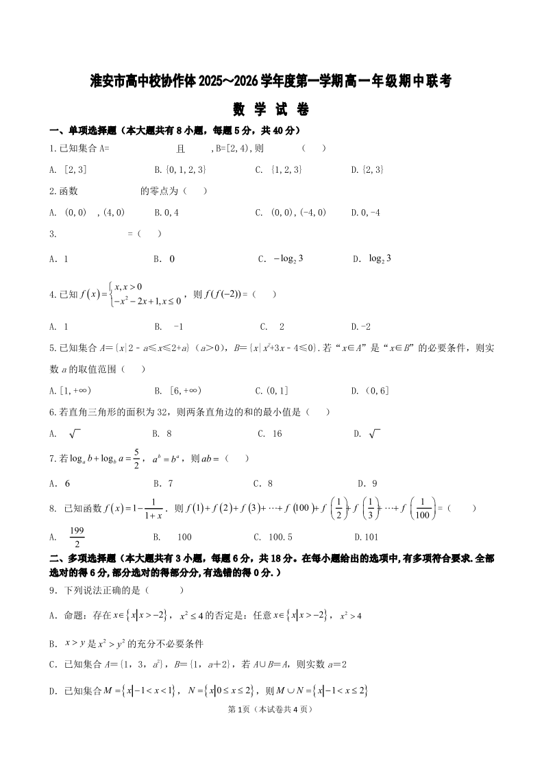 江苏省淮安市高中校协作体2025-2026学年高一上学期期中联考 数学试题(含答案).pdf