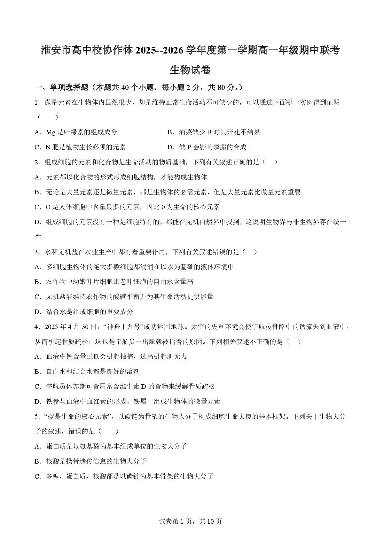 江苏省淮安市高中校协作体2025-2026学年高一上学期期中联考 生物试题(含答案).pdf