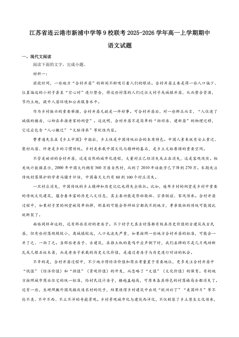 江苏省连云港市新浦中学等9校联考2025-2026学年高一上学期期中考试 语文试题(含答案).docx