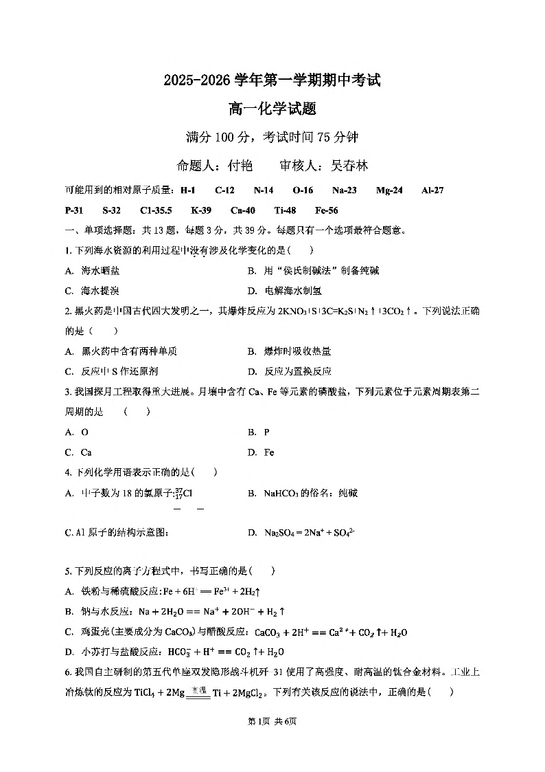 江苏省连云港市新浦中学等9校联考2025-2026学年高一上学期期中考试 化学试题(含答案).pdf