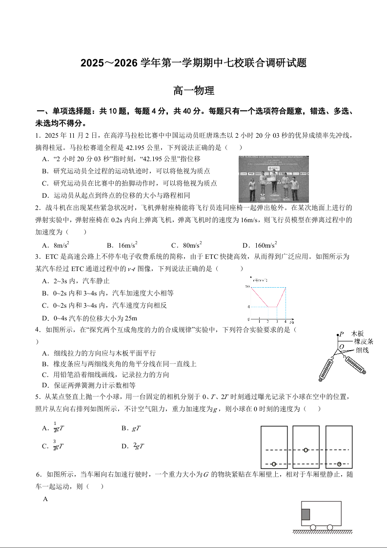 江苏省南京市七校2025-2026学年高一上学期期中联合调研 物理试题(含答案).docx