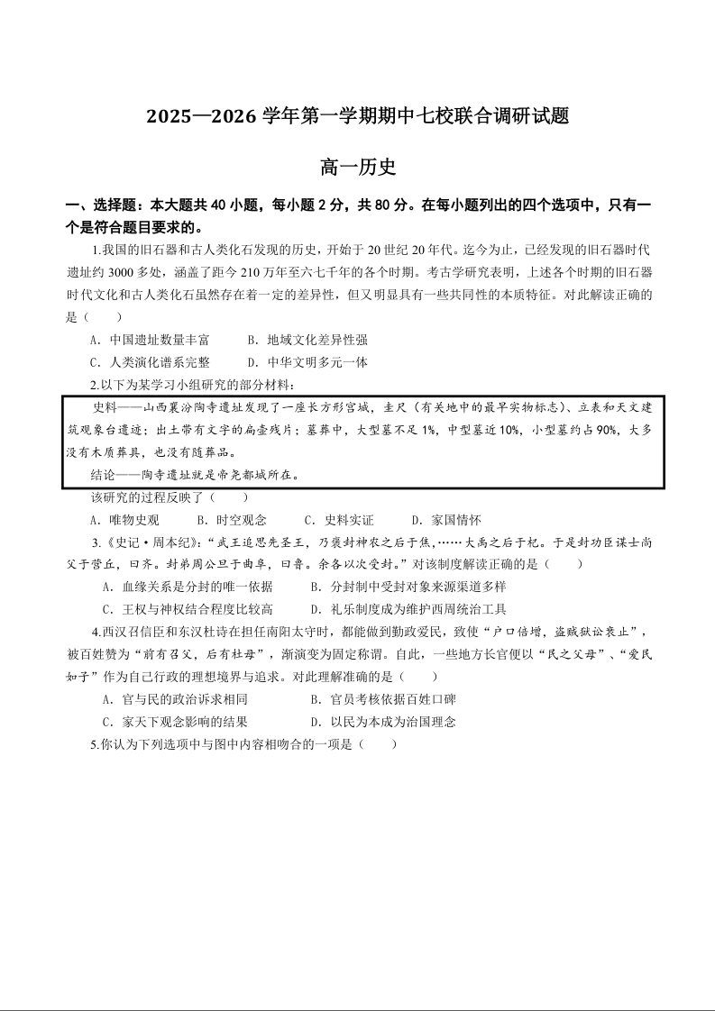 江苏省南京市七校2025-2026学年高一上学期期中联合调研 历史试题(含答案).docx