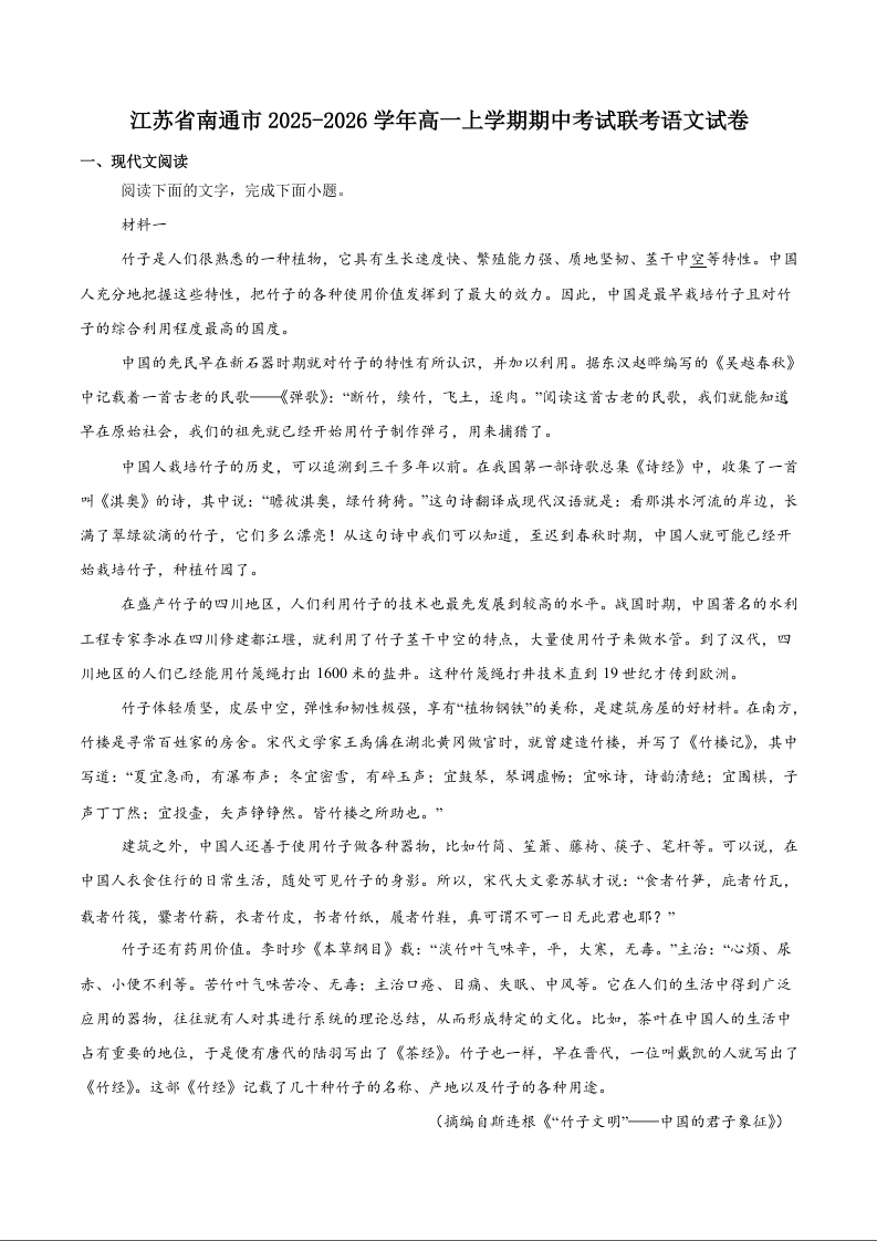 江苏省南通市2025-2026学年高一上学期期中考试 语文试题(含答案).docx
