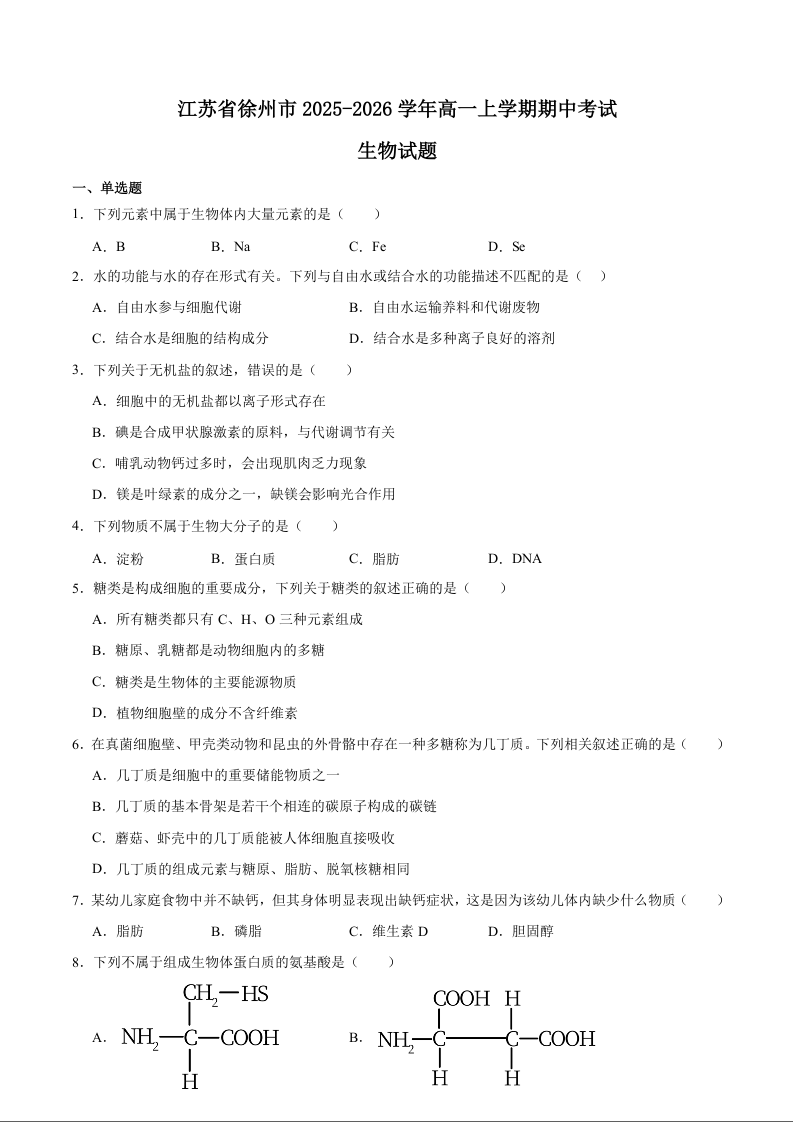 江苏省徐州市2025-2026学年高一上学期期中考试 生物试题(含答案).docx