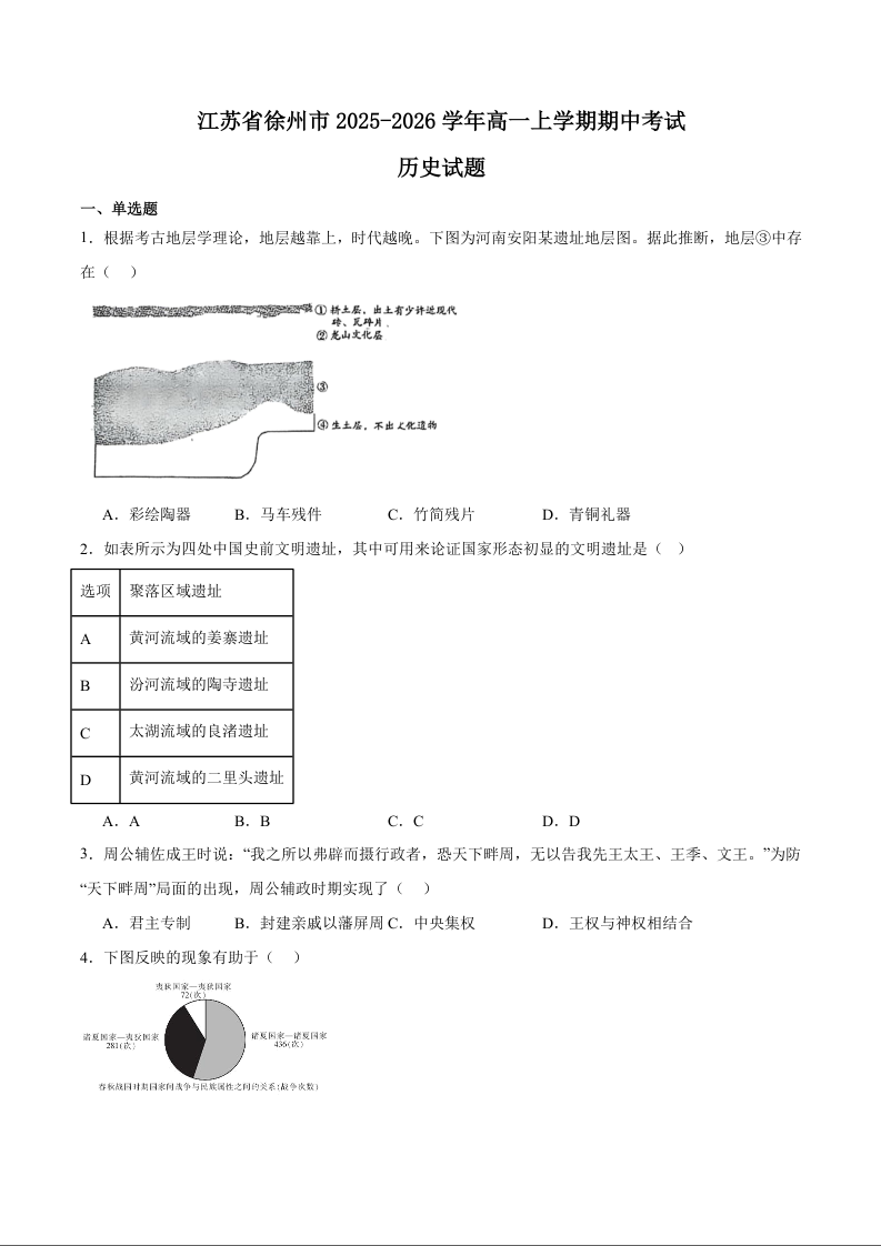 江苏省徐州市2025-2026学年高一上学期期中考试 历史试题(含答案).docx